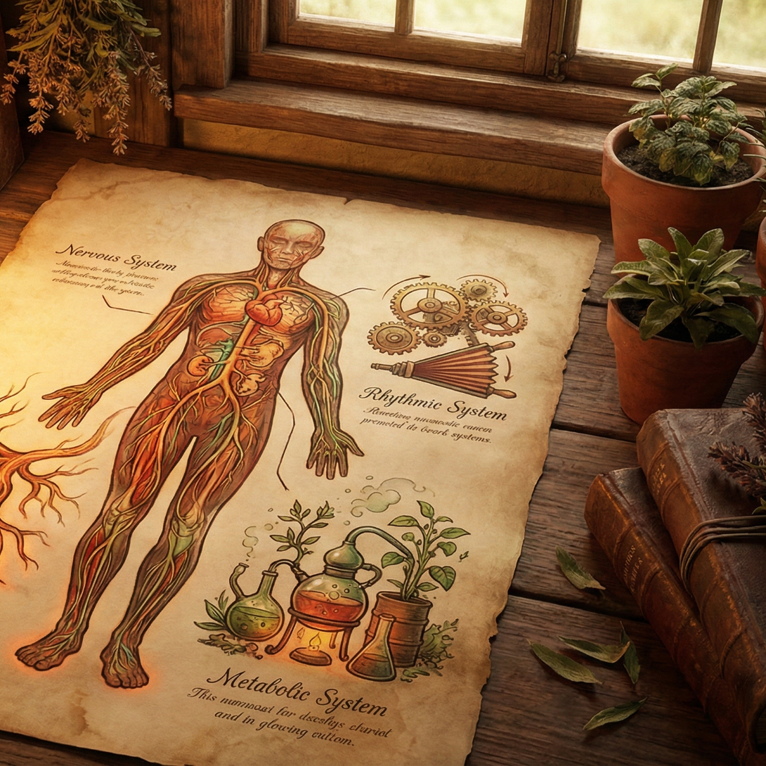 Rhythmisches System: Vermittlung zwischen den Polen, zentriert in Herz und Lunge. Erhält Harmonie durch Atmung und Kreislauf.